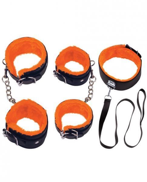 Restrain yourself. Kit includes ankle cuffs, wrist cuffs, neck collar with leash.